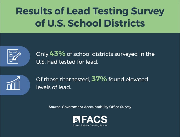 So, is school water safe to drink? The disturbing answer is that many schools likely have elevated levels of lead but are unaware because they have not tested for it. In 2017, the Government Accountability Office conducted a survey of public school districts in the U.S. The survey found that approximately half of the schools had not tested for lead, but of those that had, over a third found elevated levels of lead.