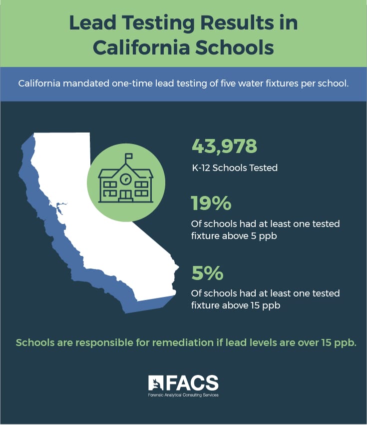 From 2017 to 2019, under AB746, California required community water systems that serve schoolsites to test for lead in K-12 schools. The program required the testing of only 5 fixtures, with the requirement of remediation if lead levels were over 15 parts per billion (ppb). (If you recall, this limit is the same as the federal standard, which is well above levels that are considered protective of health.) As limited as this testing was, it uncovered elevated levels of lead in many schools— 19% had at least one tested fixture above 5 ppb, and 5% of schools had at least one tested fixture above 15 ppb.