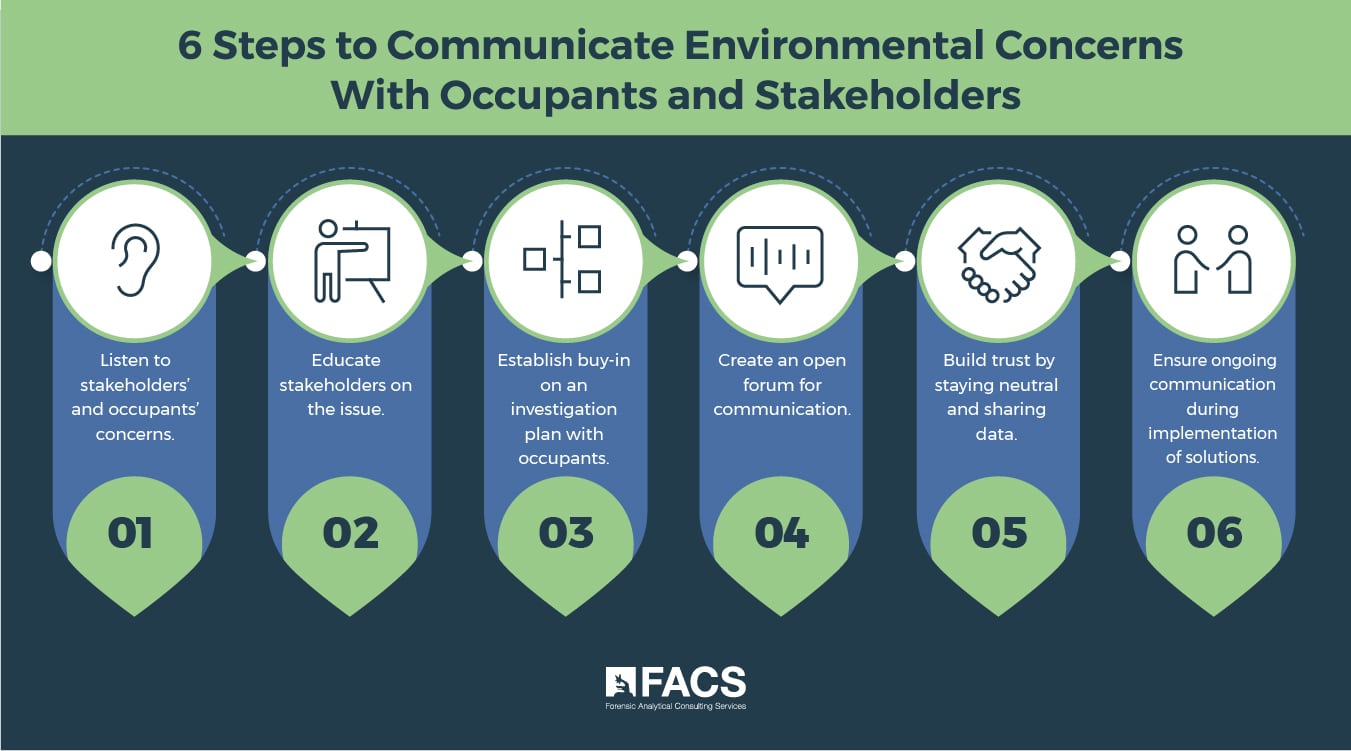 Your reaction to their concerns will either elevate their concern or begin to alleviate them. If occupants don’t feel they are being listened to or don’t understand and believe in the corrective actions, the resolution pathway becomes more complicated. Clear and open communication is critical to solving an indoor environmental issue, and the sooner you get on top of the problem, the better the outcome will likely be. Unfortunately, some organizations don’t take action or don’t call environmental health experts until the situation reaches a boiling point.