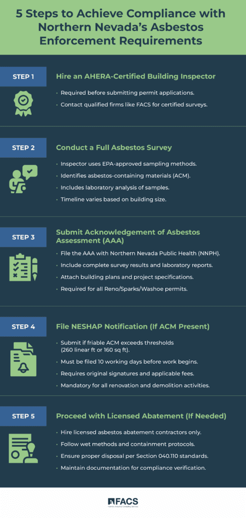 It’s important to note that these are not entirely new rules. The EPA NESHAP regulations have been in place since 1970. However, NNPH—serving Washoe County, including Reno and Sparks—has heightened enforcement, particularly requiring AHERA-accredited Building Inspectors for asbestos surveys as a prerequisite for building permits. This shift aligns with revisions to Section 040.110 of the District Board of Health Regulations Governing Air Quality Management, adopted on March 27, 2025, following public hearings and workshops.