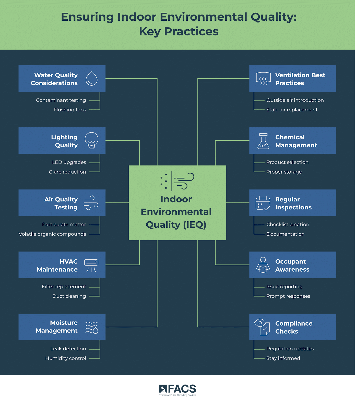 Stay informed: Regulations can change, and new standards for ventilation, energy efficiency, or chemical use may arise. To make sure you are current with regulations, schedule time with a FACS IEQ consultant.