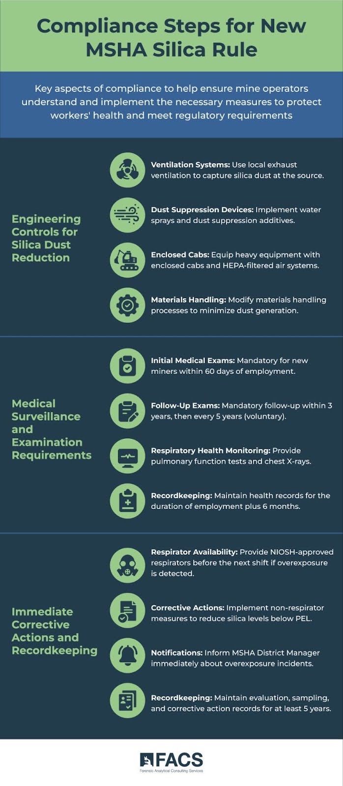 The new requirements became effective on June 17, 2024. Coal mine operators must comply within 12 months of the publication date. Metal and Non-Metal operators have 24 months to comply, allowing them additional time to meet the new standards while addressing the urgent need to protect miners’ health.