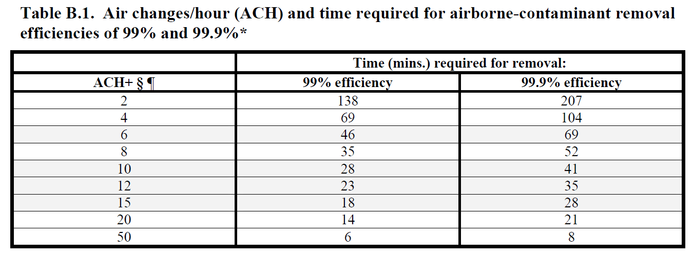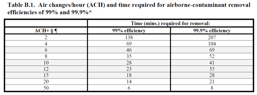 The CDC Guidelines has published a table the shows the impact of air exchange rates on the removal of airborne contaminants from a controlled space. It looks at the time it takes to remove 99% and 99.9% of airborne contaminants based on the number of air changes per hour (ACH). Air changes per hour is a description of how many times the full volume of room air is exchanged. Increasing the ACH reduces the time needed.